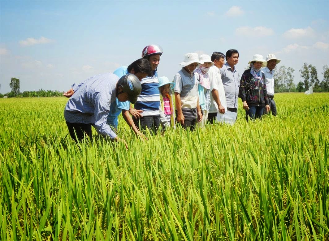 Nông dân và cán bộ Chi cục Bảo vệ thực vật tỉnh thăm ruộng lúa áp dụng mô hình quản lý dịch hại sử dụng thuốc theo phương pháp “4 đúng” ở xã Hưng Hội (huyện Vĩnh Lợi). Ảnh: H.L