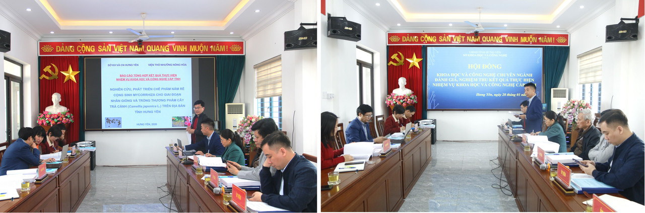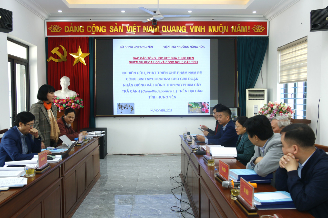 Ngày 28/01/2026 tại Hội trường Sở Khoa học và Công nghệ, Hội đồng khoa học và công nghệ chuyên ngành đánh giá, nghiệm thu kết quả thực hiện nhiệm vụ khoa học và công nghệ cấp tỉnh sử dụng ngân sách nhà nước đã tiến hành nghiệm thu, đánh giá kết quả thực hiện đề tài khoa học “Nghiên cứu, phát triển nấm rễ cộng sinh Mycorrhiza cho giai đoạn nhân giống và trồng thương phẩm cây trà cảnh (Camellia japonica L.) trên địa bàn tỉnh Hưng Yên” được ghi trong Kế hoạch Khoa học và Công nghệ tỉnh Hưng Yên năm 2023, năm 2024, năm 2025 do Viện Thổ nhưỡng Nông hóa chủ trì và thực hiện.