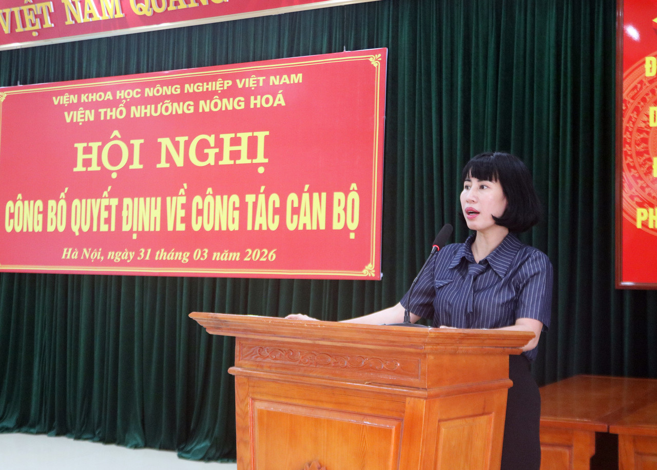 Phát biểu nhận nhiệm vụ, Bà Trần Thị Minh Thu bày tỏ sự trân trọng và cảm ơn sâu sắc tới lãnh đạo Viện Khoa học Nông nghiệp Việt Nam đã tin tưởng giao nhiệm vụ, đồng thời gửi lời cảm ơn chân thành tới Ban Lãnh đạo Viện Thổ nhưỡng Nông hóa cùng toàn thể cán bộ, viên chức của Viện đã luôn đồng hành, hỗ trợ trong suốt quá trình công tác. Trên cương vị được giao, Bà khẳng định sẽ tiếp tục nỗ lực, tận tâm, cùng tập thể lãnh đạo Viện phát huy truyền thống đoàn kết, thúc đẩy đổi mới sáng tạo, nâng cao chất lượng nghiên cứu khoa học và chuyển giao công nghệ, góp phần xây dựng Viện ngày càng phát triển bền vững.