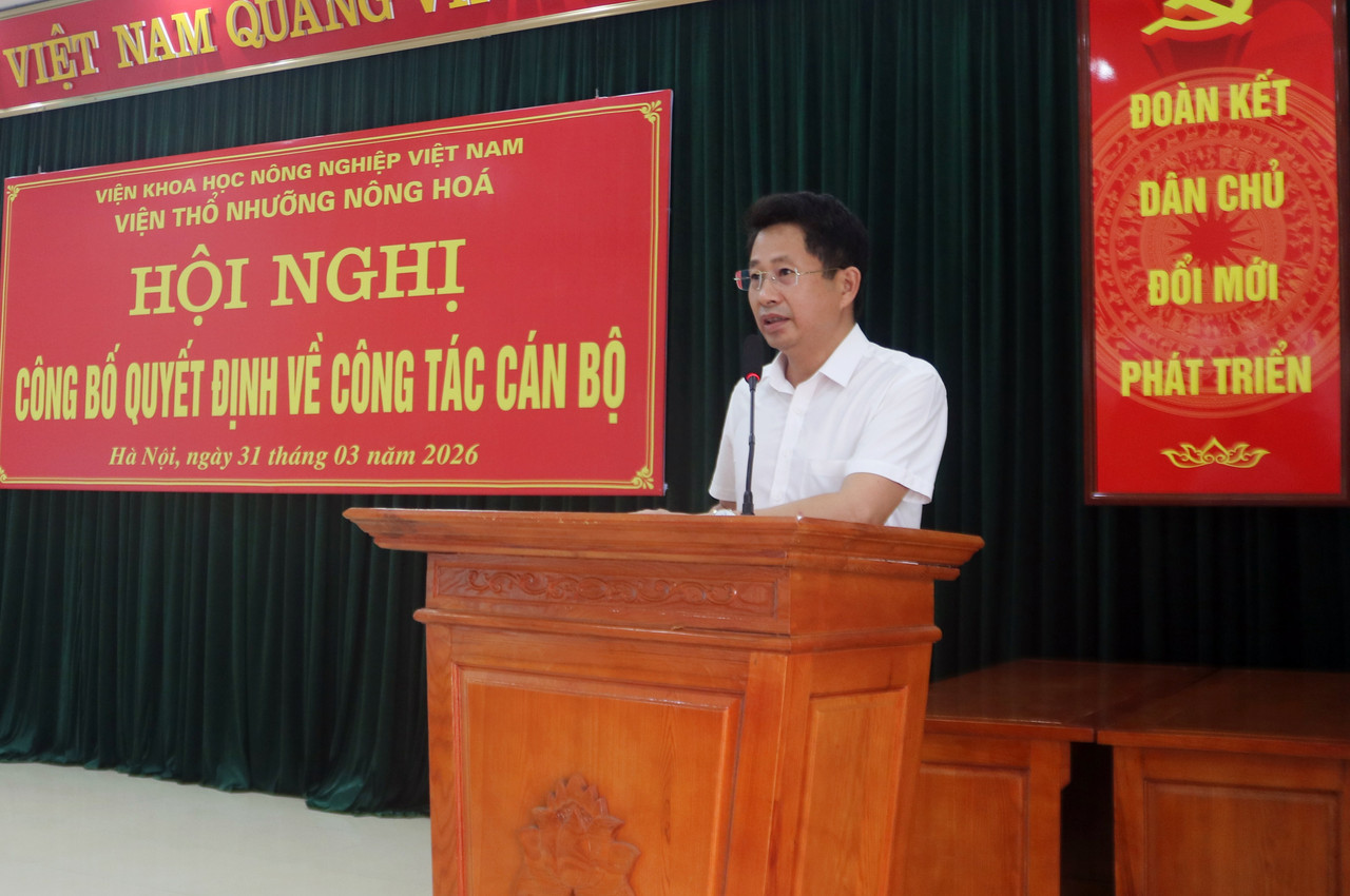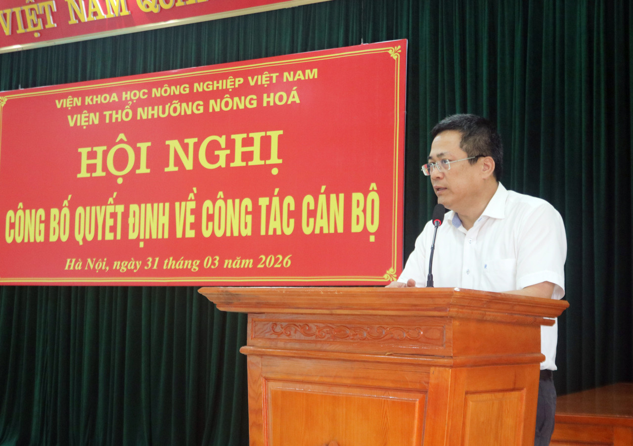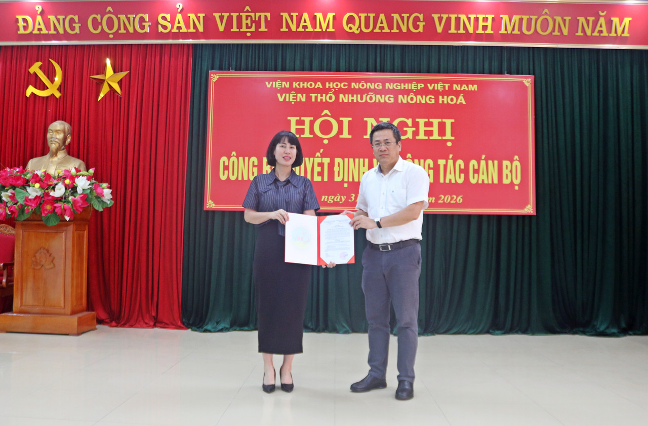 Chiều ngày 31/3/2026, tại trụ sở Viện Thổ nhưỡng Nông hóa đã diễn ra buổi lễ công bố quyết định tái bổ nhiệm chức vụ Phó Viện trưởng đối với Bà Trần Thị Minh Thu trong không khí trang trọng và ấm áp. Tham dự buổi lễ có PGS.TS Trần Minh Tiến – Phó Giám đốc Viện Khoa học Nông nghiệp Việt Nam cùng toàn thể cán bộ, viên chức của Viện.